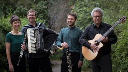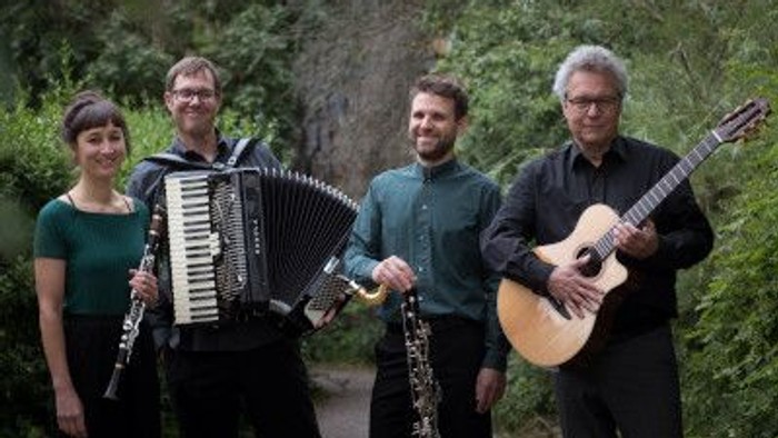 Am Akkordeon Daniel Weinland, an der Gitarre, Mandoline und Ukulele Joachim Zecher, an Klarinette, Saxophon und Bassklarinette Johanna Weihrauch und an Klarinette, Querflöte und Bassklarinette Florian Wild.